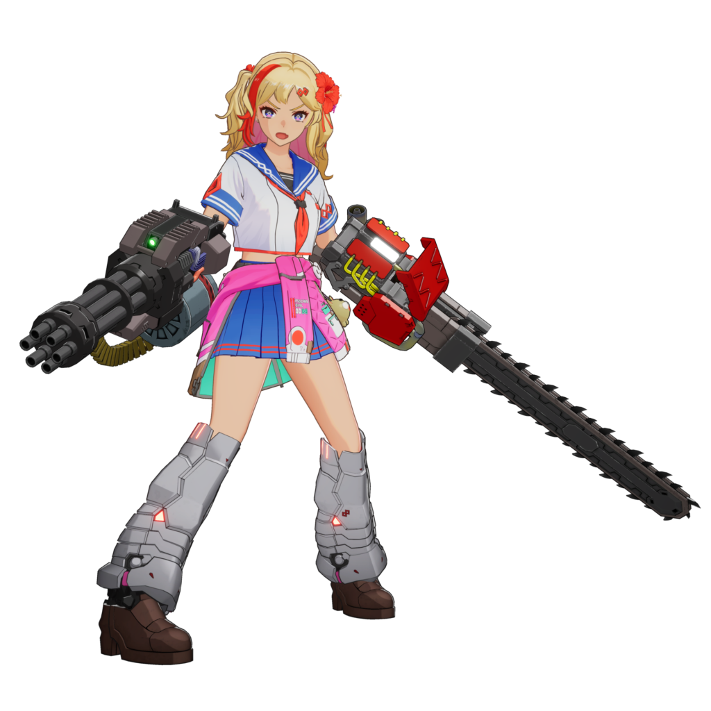 上野:ここはやっぱり、主人公の二人!リョウコとアケミですね。リョウコは、最初にキャラクター像を考えた段階から明確なイメージがありました。金髪に赤いインナーカラー、ハイビスカスのアクセサリー、個性的な小物、ルーズソックスに八重歯……“こんなキャラクターがいたら推したくなる”という理想像を、しっかり詰め込んでいます。アケミについても、メカ脚や太ももまわりのデザインなど、メカ娘としての魅力を存分に表現しました。生みの親として強い愛着があり、どちらもとても気に入っているキャラクターです。